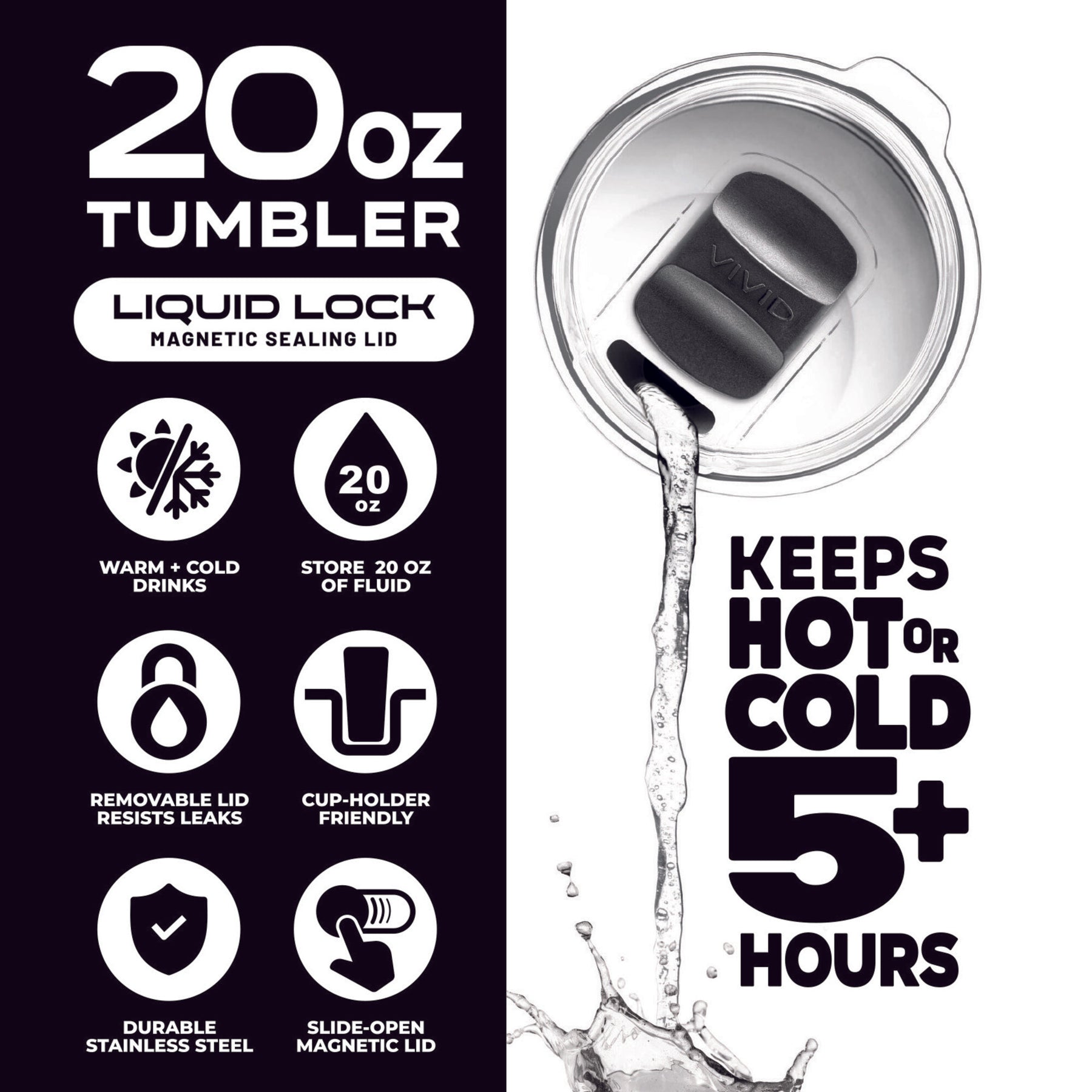 - Liquid Lock Magnetic Lid: Slide-open magnetic seal for easy, leak-resistant use