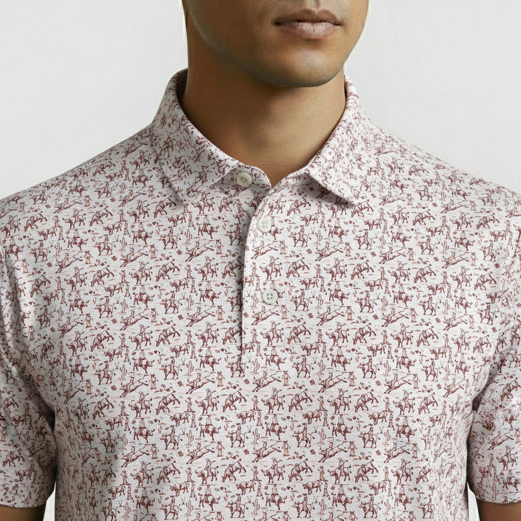 Designed to offer unparalleled freedom of movement both on and off the golf course, this lightweight polo boasts a buttery soft fabric, exceptional breathability, and moisture-wicking. The polo features a modern, tailored fit that flatters your physique without feeling constricting. With a fashionable print design and self fabric collar, this polo is ready for any occasion.